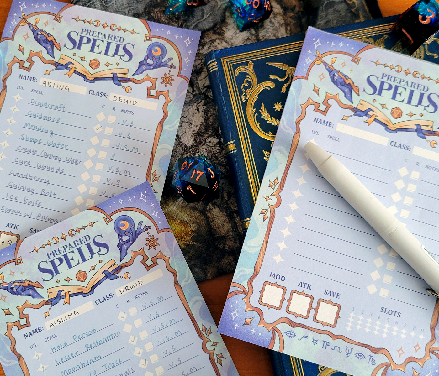 Keep track of your Prepared Spells with this magical memo pad, with space for quick At-A-Glance info about each spell that you can tailor to exactly what your eyes need to see!
